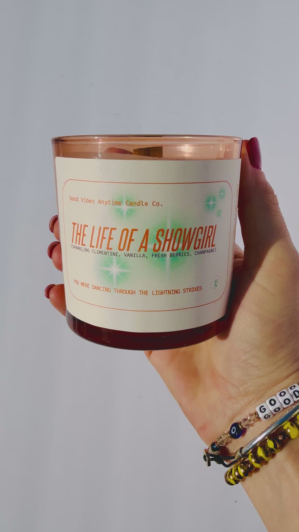 Smells like Bliss. Number twelve in our Era collection, The Life of a Showgirl inspired candle shimmers with a playful, vibrant energy. Top notes of champagne and sparkling clementine combine with the soft sweetness of juicy berries over a dreamy base of vanilla. This scent embodies the heart of the era, full of light, love confidence, and celebration. With notes both bold and soft, this fragrance captures the effortless balance that defines a true Showgirl.